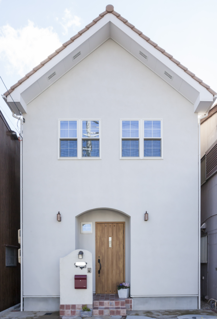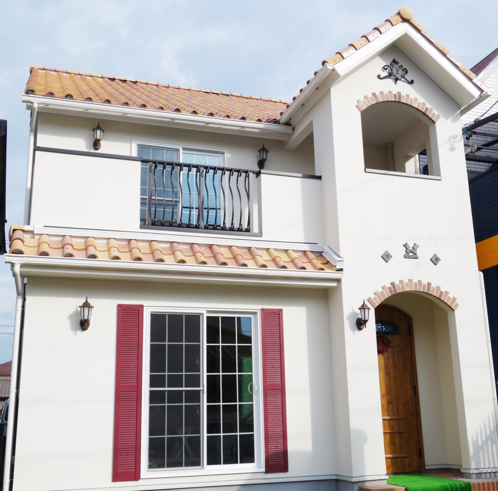 👆白い塗り壁と洋瓦、そして赤いシャッターパネルが